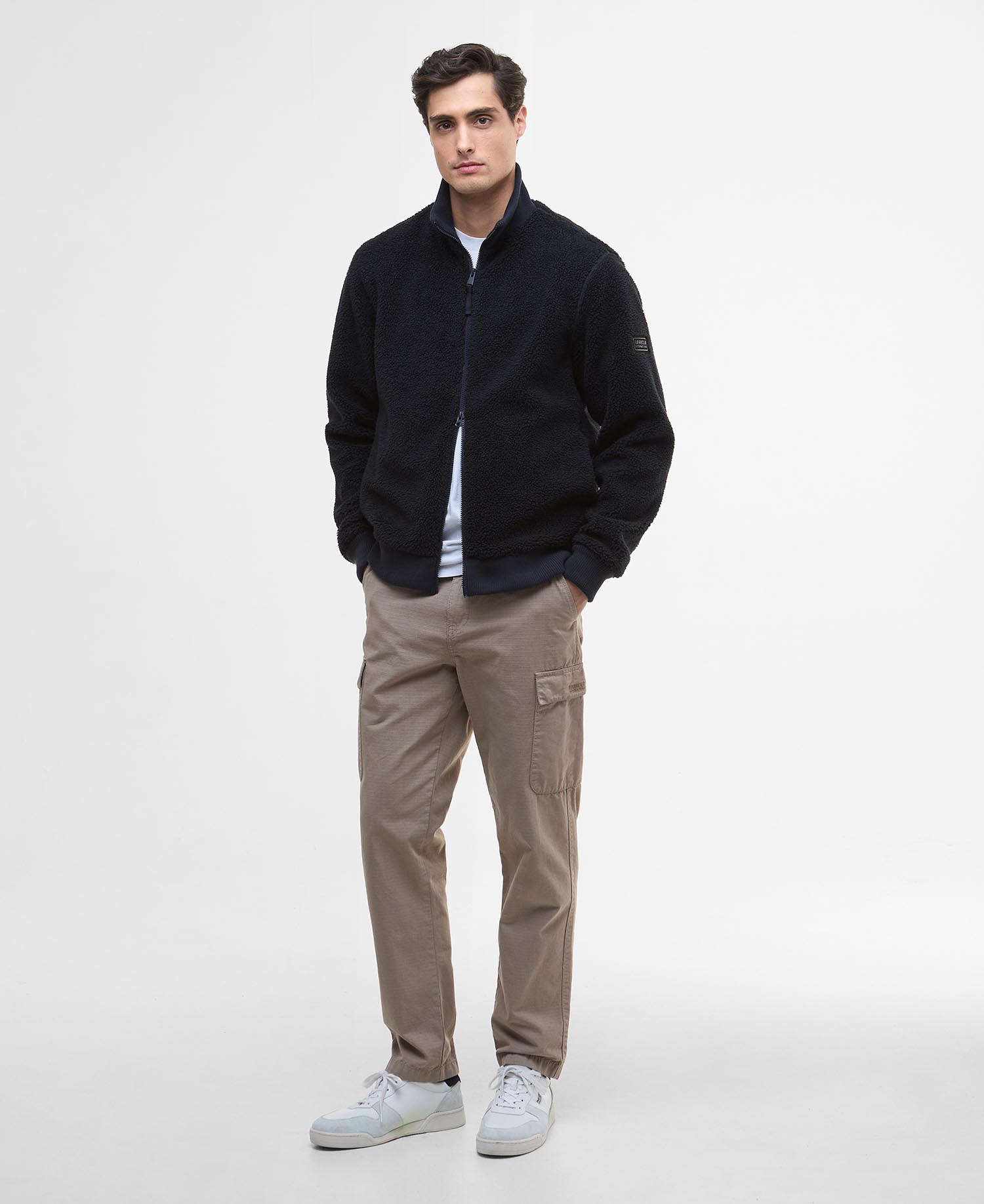Featuring an all over borg fabric, the Barbour International Dinstone Fleece Jacket boasts rib detailing to the neck, hem and cuffs. Styled with two pockets and an embossed lozenge to the left sleeve, it makes the perfect every day styling option.