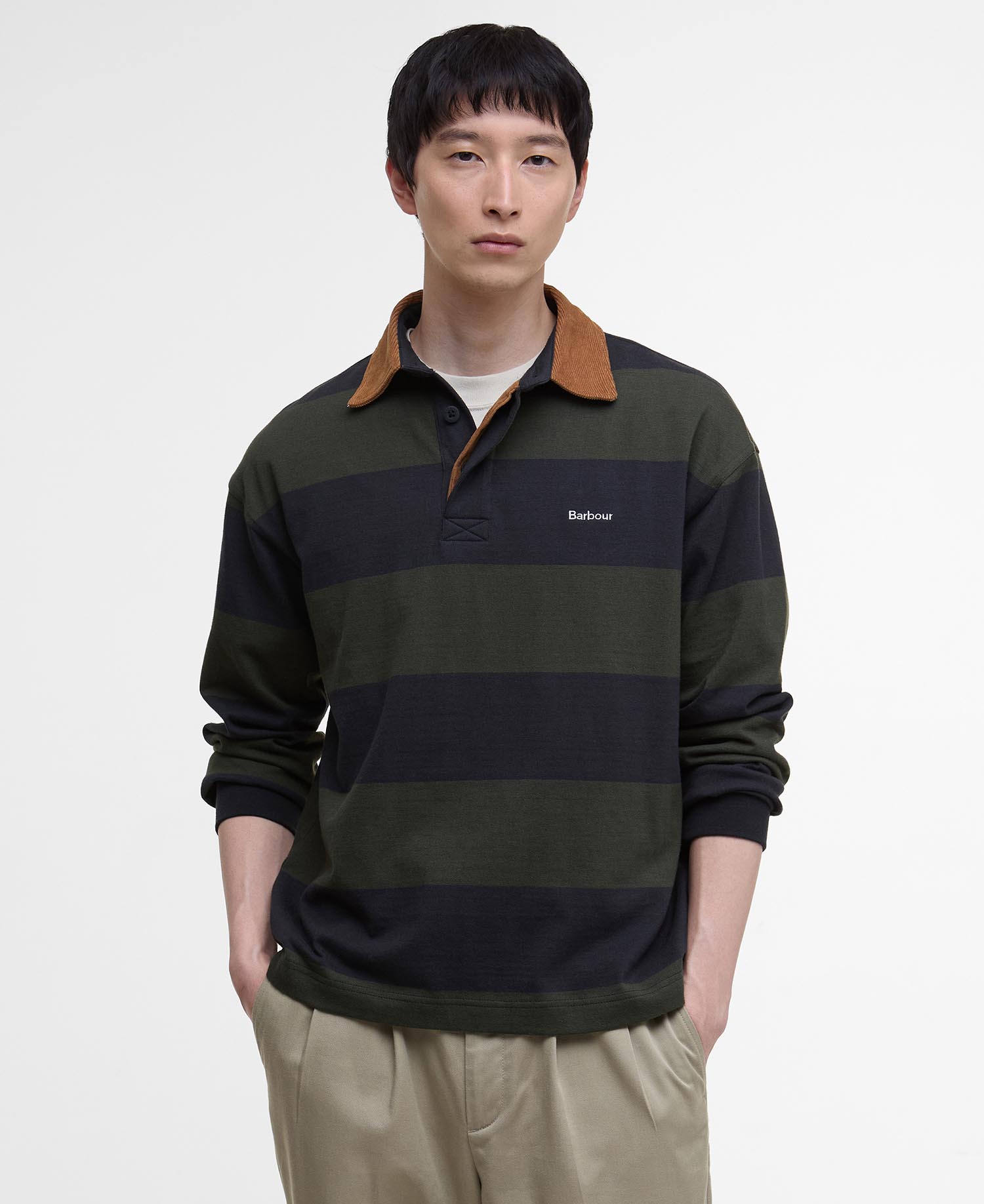 Exuding a sporty finish thanks to the classic contrasting cord collar and striped print, the Barbour Newclose Oversized Rugby Shirt features long sleeves with a concealed button placket for a clean look. Woven from soft cotton jersey for extra comfort on casual days, it boasts logo embroidery to the upper chest: a subtle mark of quality.