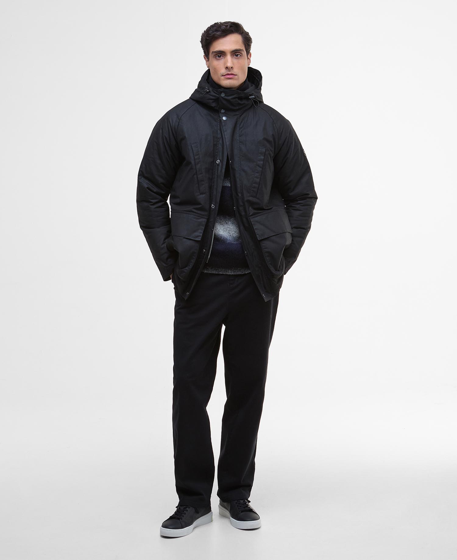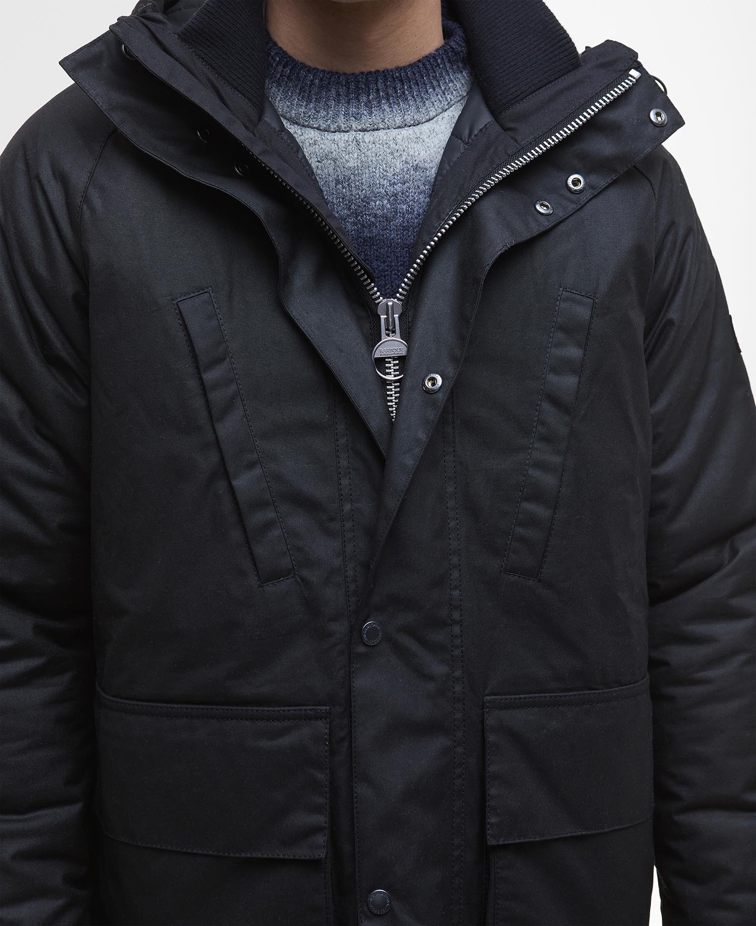 The Barbour International Oakdale Wax Jacket takes inspiration from a classic duffle design with its double storm front fastening and inner quilting. Perfect for wearing as the cold season kicks in, the lower bellow and reverse entry chest pockets add a functional spin while the ribbed cuffs and collar offers a casual look and feel.