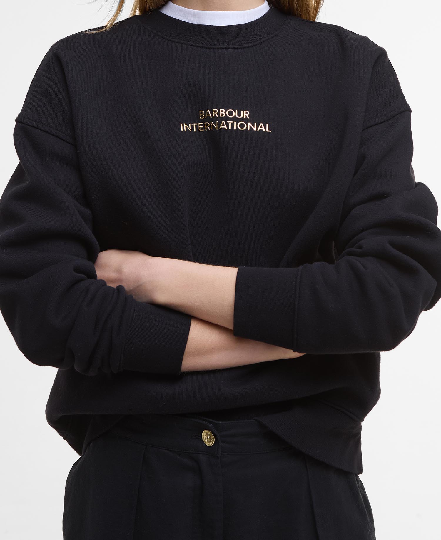 Make a statement while showcasing your brand loyalty to Barbour International with the B.Intl Kaia Logo Sweatshirt. Crafted from 100% cotton, this relaxed fit sweatshirt features a gold foiled rendition of the Barbour International logo and is perfect for pairing with leggings or jeans for an off-duty day.