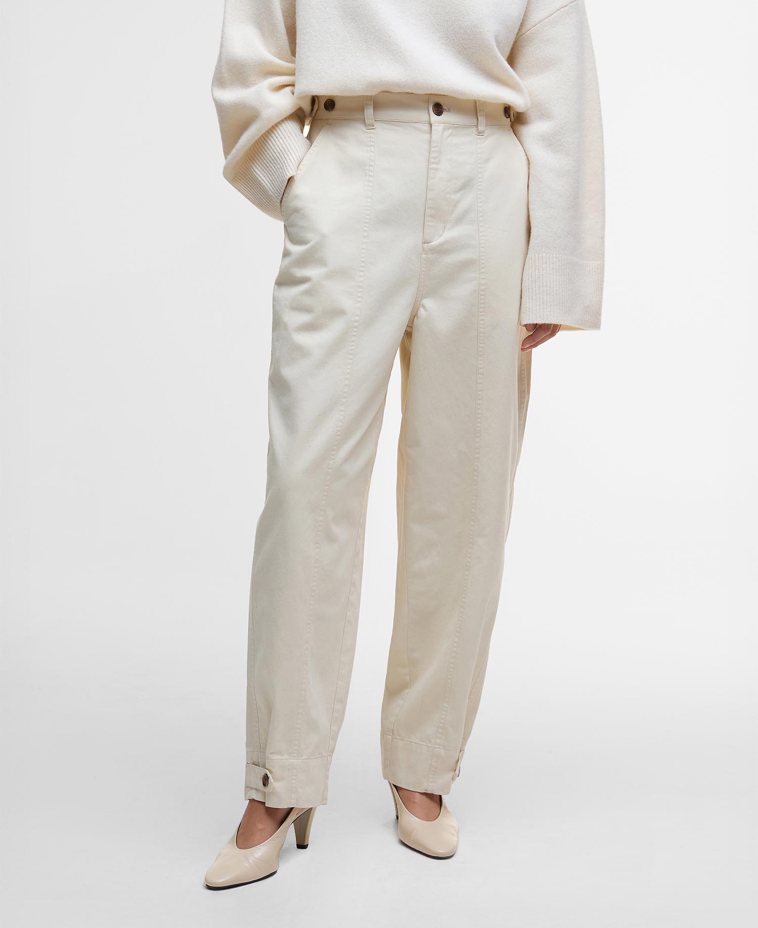 Elevate your everyday style with the Barbour Martha Straight-Leg Trousers. Made from soft, breathable cotton with refined seam detailing, these trousers combine versatility and elegance. Featuring adjustable buttons at the waistband and hem, they offer a personalised fit that adapts to your day. Perfect for a casual stroll through town, these trousers deliver effortless comfort with a polished finish.