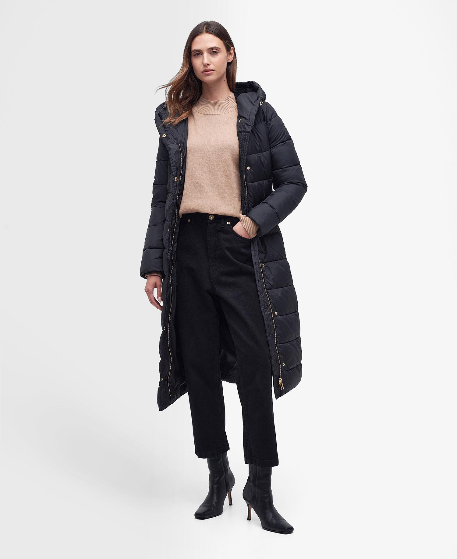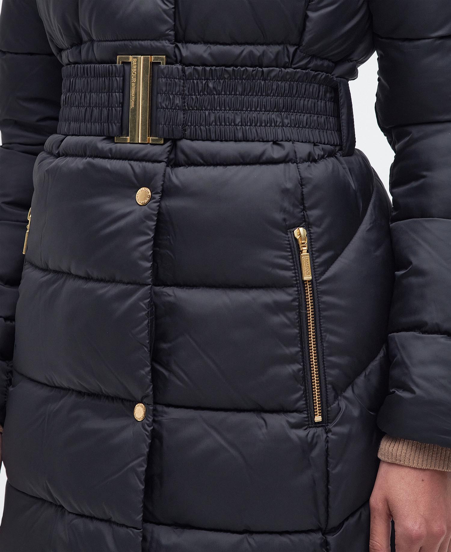 The Barbour International Track Line Quilted Jacket boasts an elasticated belt to the waist for a feminine silhouette, this jacket offers a straight baffle quilting to the front and chevron quilting to the back. Branding to the sleeve effortlessly finishes the garment.